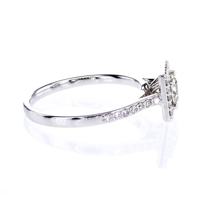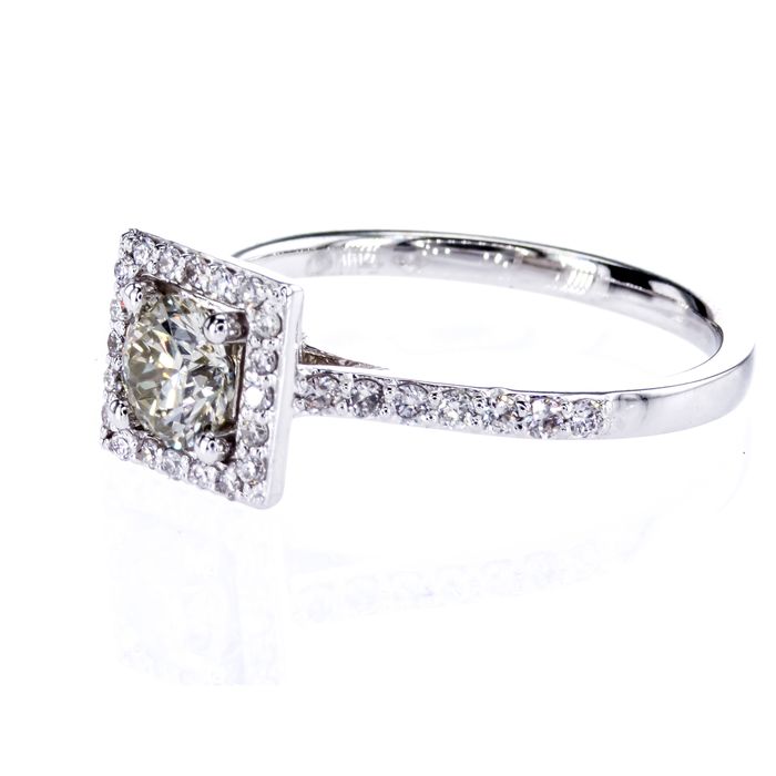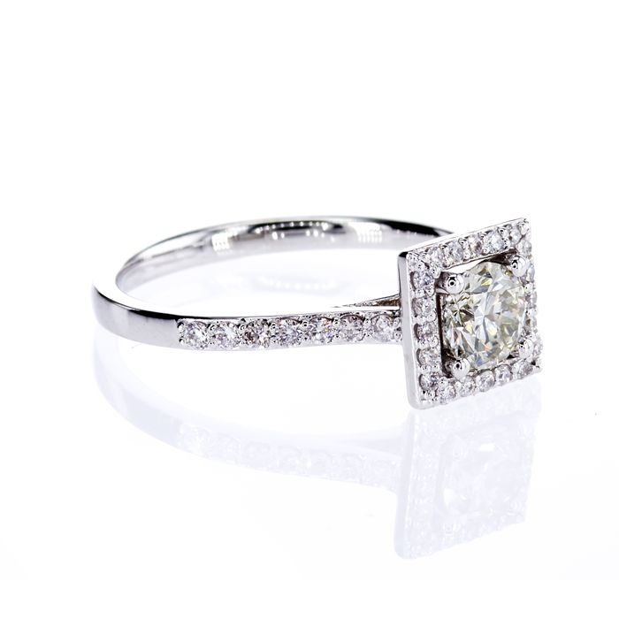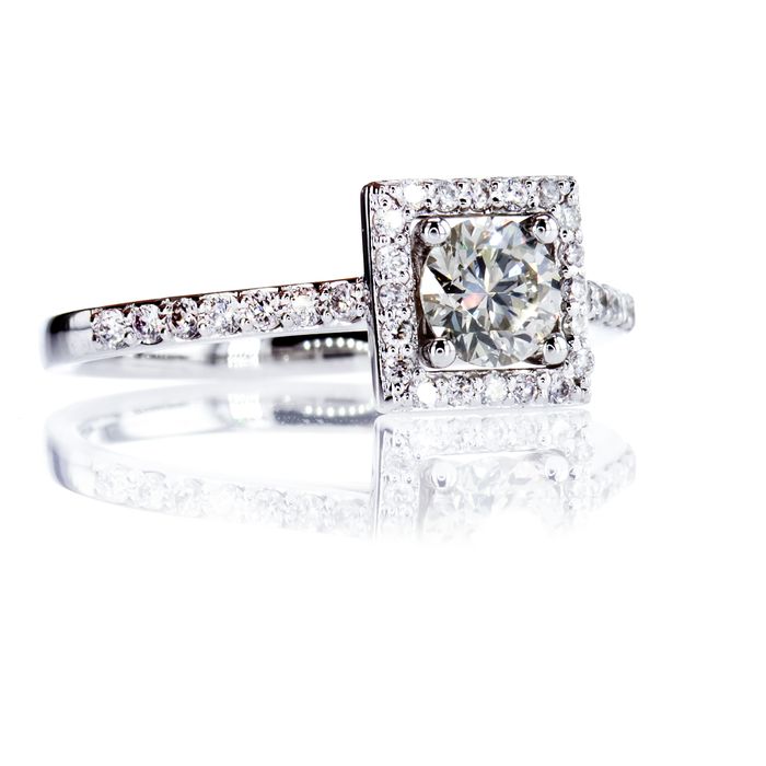 SONJA diamond ring with a 0.52ct. Center stone surrounded by a square design filled with 34 white diamonds. This ring is a modern take on a classic style. This modern take on the diamond ring design is a classic yet timeless piece that is sure to turn heads. The 0.52ct. large round diamond in the center is surrounded by a square design filled with 34 white diamonds. An elegant and timeless piece. An eye-catching ring whether you're looking for an engagement ring or for any other special occasion.