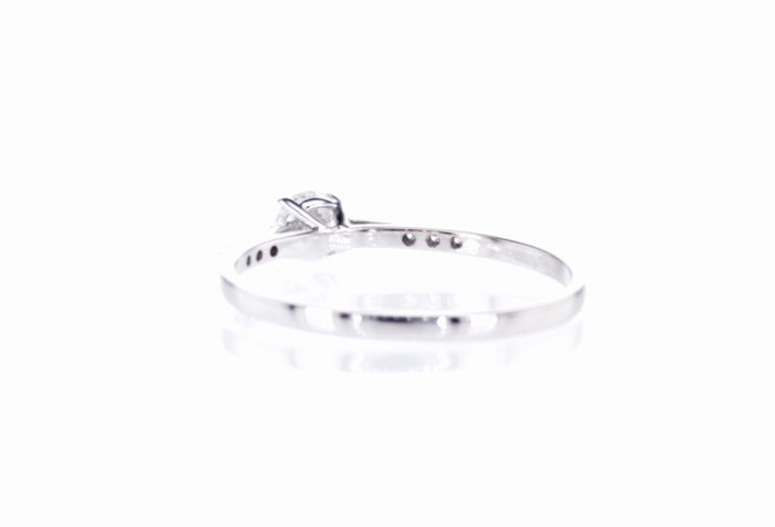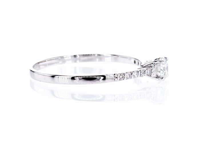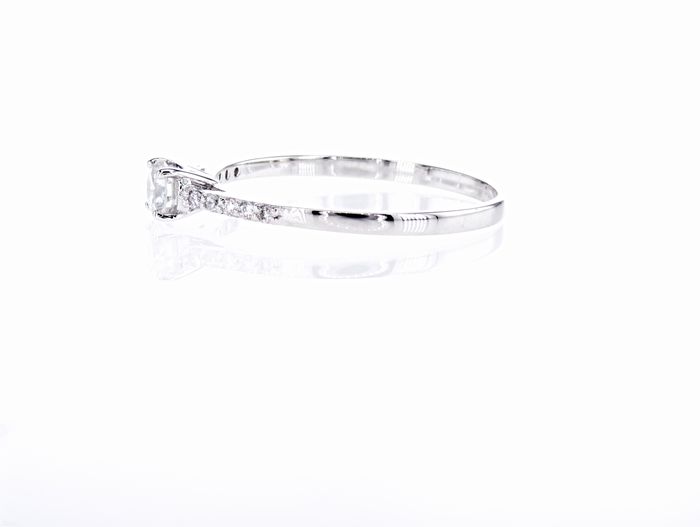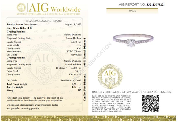 An engagement ring is a symbol of love and commitment, so it's important to find one that perfectly suits your style. The LEA 0.31ct diamond ring is a beautiful option with a total carat weight of 0.31. The main diamond is 0.230ct with a cut grade of excellent to very good, and it is surrounded by 10 other diamonds that weigh 0.080ct. The ring is made of 14 K white gold, making it a luxurious and timeless choice.