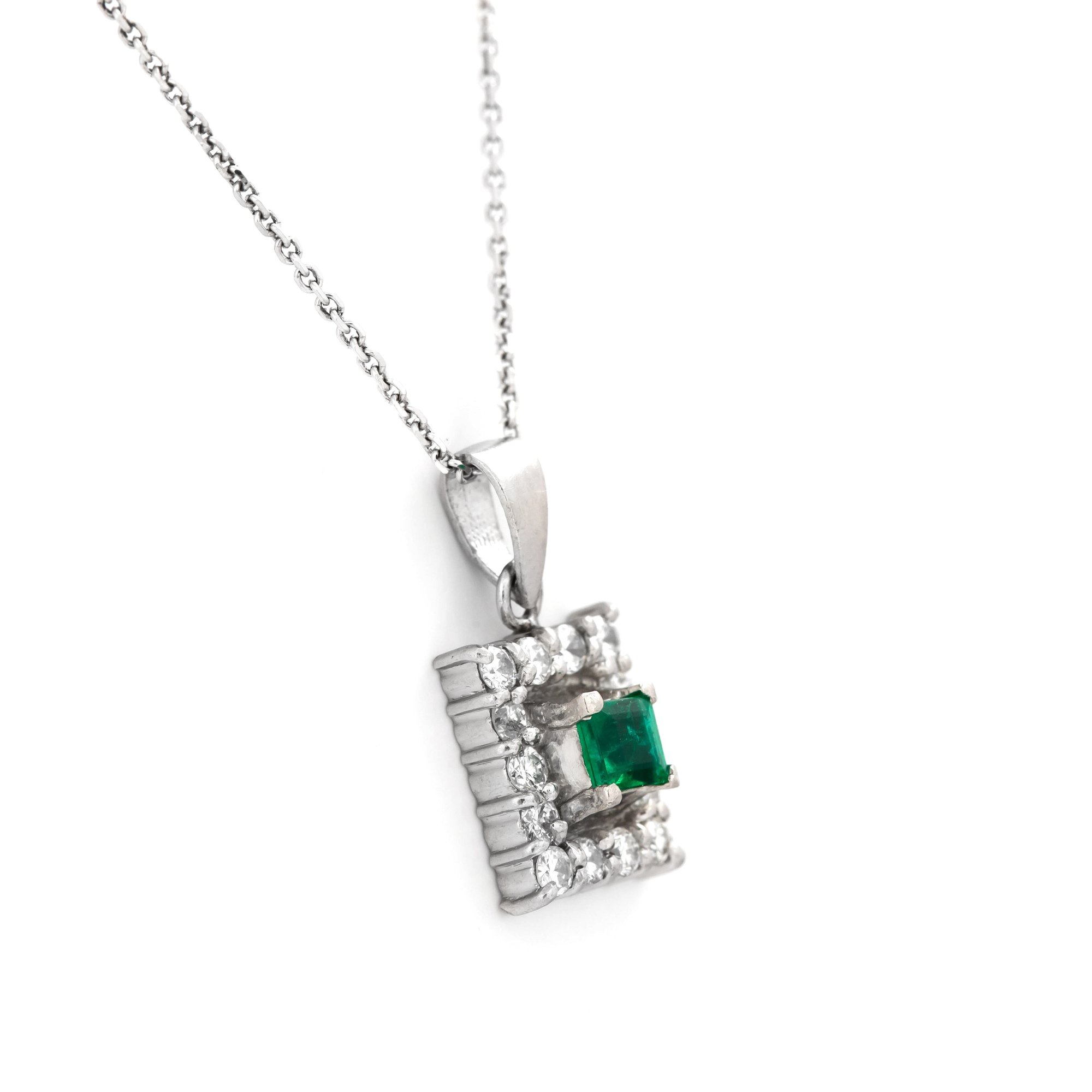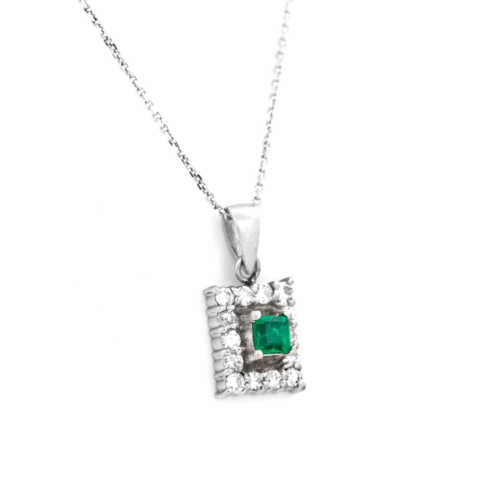 NINA is a luxurious necklace with a 0.45 total stone carat weight pendant. The main stone is a square cut natural emerald that weighs 0.28ct. The 14 round brilliant cut colorless diamonds surrounding the emerald have a combined weight of 0.17ct. The entire piece is made of platinum. The chain's length is 48 cm.